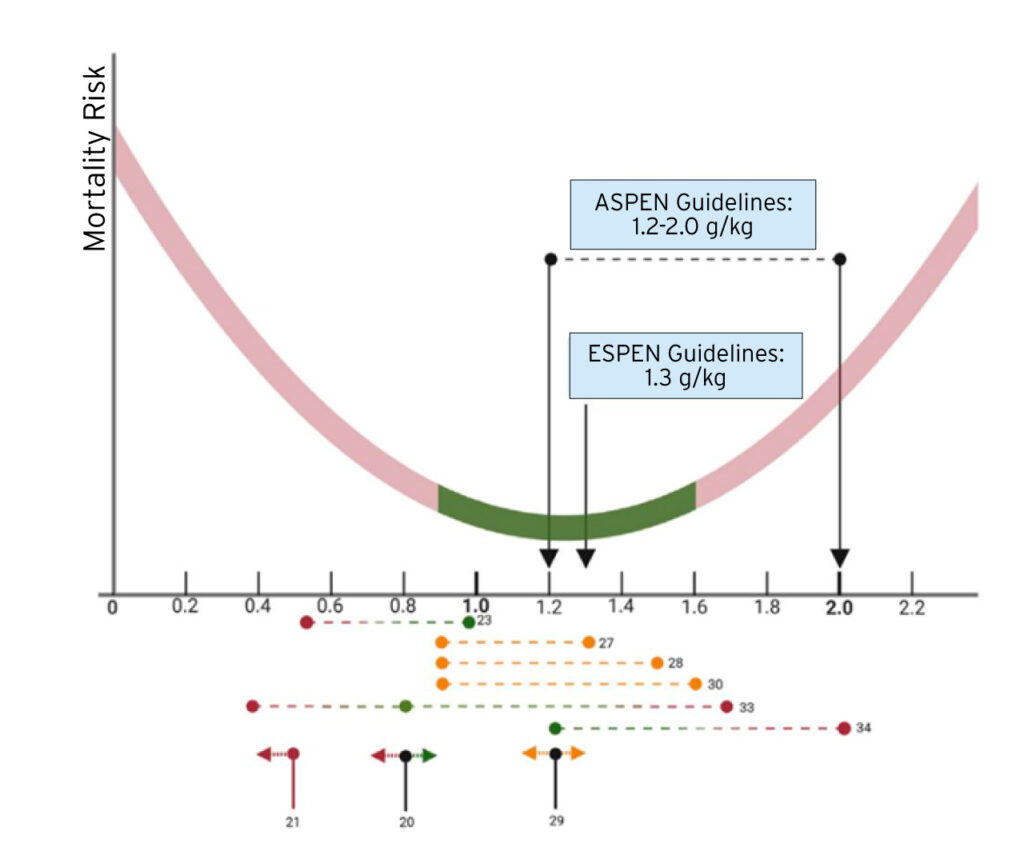 Es importante tener en cuenta que los pacientes críticos pueden experimentar efectos adversos si su ingesta de proteínas es inferior a los objetivos recomendados o se sitúa considerablemente por encima de ellos. Es probable que se produzca una asociación más en forma de U entre la dosis de proteína y el pronóstico. Además, para los pacientes críticos resulta difícil cumplir estas recomendaciones y mantenerlas dentro de la zona de seguridad. Los pacientes críticos que reciben una ingesta baja de proteínas (<1,0 g/kg/d) en comparación con aquellos con una ingesta alta de proteínas (>1,0 g/kg/día) muestran una fuerza muscular más débil al momento del alta de la UCI y una tasa de recuperación más lenta para caminar de forma independiente antes del alta (1).