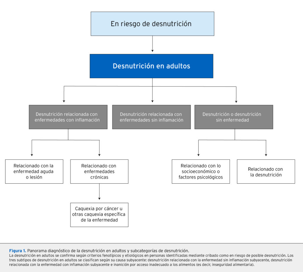 En los últimos 50 años, la malnutrición en el paciente adulto se ha reconocido cada vez más como una consecuencia perjudicial de enfermedades crónicas y agudas. Según su causa, se identifican tres subtipos. Ver (Fig. 1) (1).