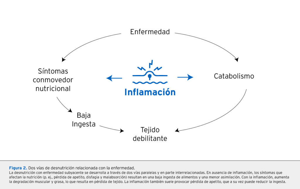 La desnutrición en adultos sigue dos vías patológicas principales: la privación de nutrientes y la anorexia inducida por inflamación con catabolismo tisular. La pérdida de masa muscular y la debilidad contribuyen a la sarcopenia y agravan la fragilidad en los adultos mayores. Las principales consecuencias negativas son una mayor susceptibilidad a las infecciones y la disfunción de los principales sistemas orgánicos (Figura 2) (1).