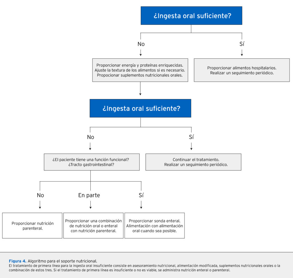 Las personas con desnutrición deben recibir asesoramiento nutricional y nutrición oral, enteral o parenteral, según corresponda. La monitorización electrolítica, cardíaca y respiratoria es esencial para prevenir el síndrome de realimentación. Una nutrición de precisión permitirá un tratamiento personalizado (Fig 3) (1).