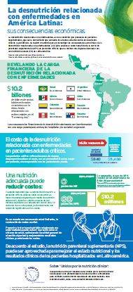 Un estudio publicado recientemente por Correia y colaboradores 4 sugiere que esto representa una tremenda carga financiera para el sistema de salud. El estudio estima que el costo de las complicaciones relacionadas con la desnutrición hospitalaria en ocho países de América Latina asciende a $10.2 billones cada año, lo que representa el 3% del gasto total en salud de estos países. Además, se demostró que los pacientes adultos críticamente enfermos representan una parte desproporcionada de los costos, con un promedio de 6.5 veces más altos los costos relacionados con la desnutrición en comparación con los pacientes en salas médicas.4