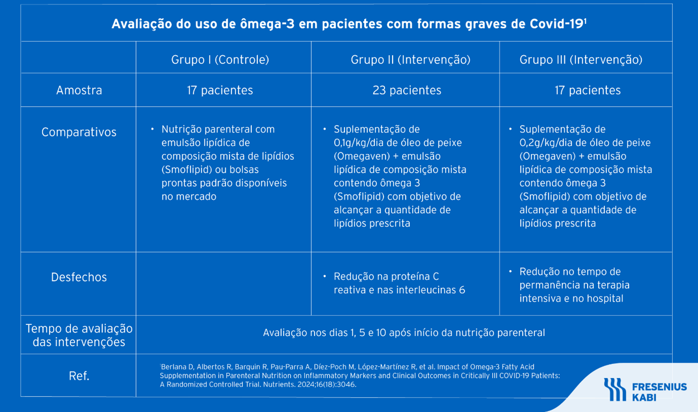 O estudo apresentando nesse artigo traz o diferencial de ser um ensaio clínico publicado em 2024, em um modelo duplo cego randomizado objetivo de comparar os efeitos da suplementação de ômega-3 em emulsões lipídicas de nutrição parenteral em pacientes de UTIs com formas graves de Covid-19 (veja mais no infográfico)1.