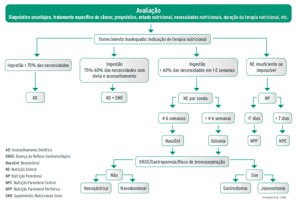 A escolha da via de nutrição no paciente com câncer depende de diversos fatores, como mostra a figura abaixo.
