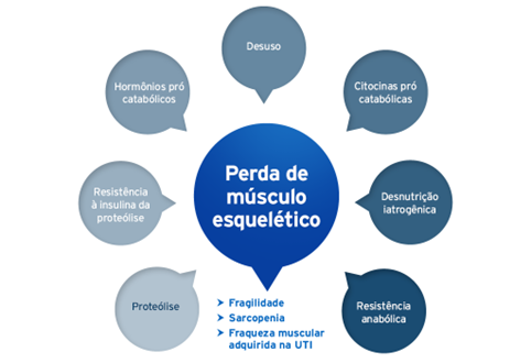 A inflamação desencadeia a intensificação da proteólise, resultando na destruição de proteínas musculares (como actina e miosina), exacerbando ainda mais a perda de massa muscular e de peso (5). Assim, muitos pacientes críticos apresentam desnutrição e fraqueza muscular adquirida na UTI (6, 7).